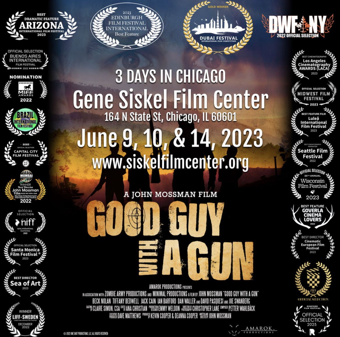 CHICAGO, IL - May 31, 2023: AMAROK PRODUCTIONS (Kevin Cooper & DeAnna Cooper) is pleased to announce the return to Chicago of the award-winning John Mossman Film GOOD GUY WITH A GUN. Mossman is thrilled to bring the film home to Chicago, where the film was germinated, cast, and completed in the Chicagoland area. GOOD GUY WITH A GUN will play on Friday, June 9 at 8:00 pm, Saturday, June 10 at 2:00 pm, and Wednesday, June 14 at 6:00 pm. John Mossman plus cast and crew scheduled to attend all screenings. Tickets are available at https://www.siskelfilmcenter.org/good-guy-gun.